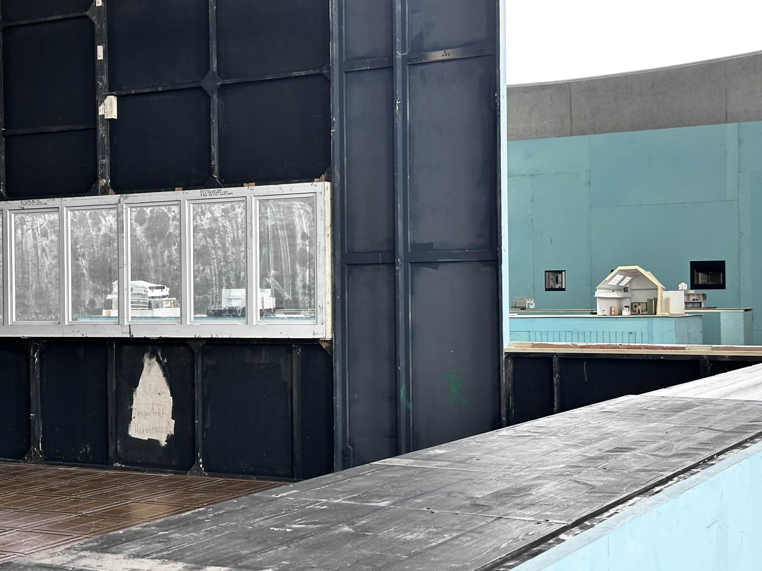 Im Mittelpunkt von Viebrocks Konstruktion sind Stücke aus einem Bühnenbild zur Lehar-Operette „Guiditta“, die 2021 in München unter Christoph Marthaler gegeben wurde. Hier in Neuss sind die noch vorhandenen Bühnenteile der Münchener Inszenierung in eine Installation gebracht. Durch sie bewegen sich die Besucherinnen und Besucher. Entlang von Wänden, Fenstern, die Blicke auf Kulissenrückenteile mit Bezeichnungen freigeben, die offensichtlich dem Zusammenbau des Ganzen dienen. Raum, Architektur und Skulptur finden hier zusammen. Ungewöhnliche Zusammenstellungen mit zum Teil gefundenen Objekten lassen in den ausgestellten Bühnenmodellen Fabrik- und Sporthallen, aufgeschnittene Häuser und auch Gesellschaftssäle entstehen.